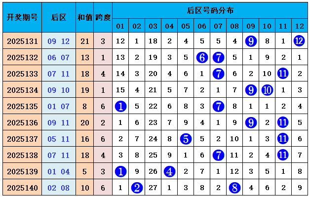 前区2路分析:前区2路号码上期开出1个号码05,前十期断区2次,前十期2路号码开出16个号码,走势较冷,本期看好2路号码走势升温,本期看好出2个2路奖号,关注号码:02、11