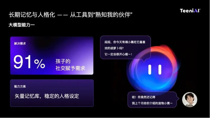 91% 的孩子在与 AI 的互动中有社交需求,需要 AI 记住他们的偏好、习惯以及小细节。例如,孩子的 AI 会记住他有一个宠物叫「小黑」,喜欢吃胡萝卜,几天后 Teeni 会提问:「你给小黑喂胡萝卜了吗?」这样的记忆能力让孩子感觉 AI 像是一个真正的伙伴。