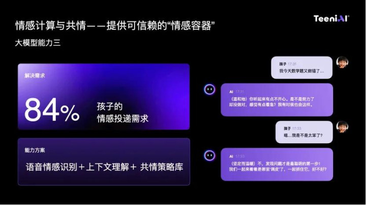为了做到这点,我们做了一个语音的情感识别,加上上下文理解,以及 Teeni.AI 的共情策略库。