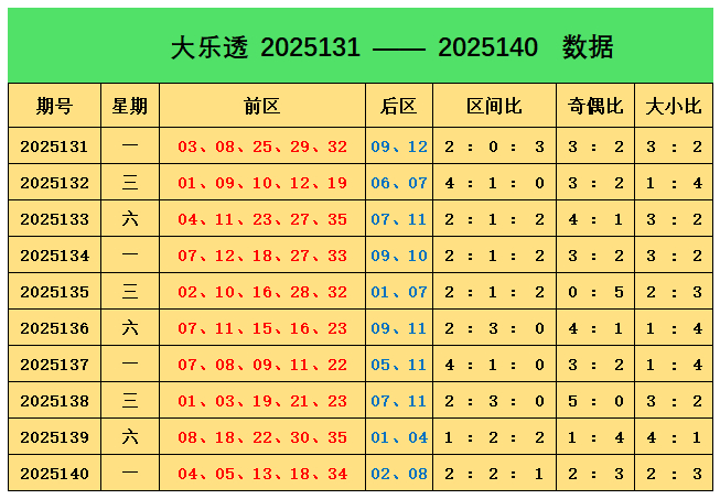 上期回顾:大乐透第2025140期奖号为:前区04、05、13、18、34,后区02、08,前区奖号三区比为2:2:1,奇偶比为2:3,大小比为2:3,后区开出小大组合02、08